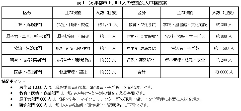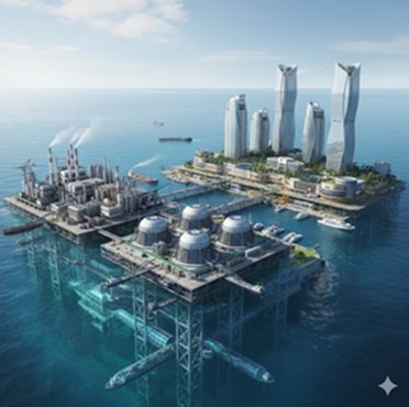 日本が海洋原子力の活用を最も現実的に可能性のある場所の一つが、南鳥島の近海です。南鳥島は東京から約1,900km離れた孤島で、周辺の海底には高品位のレアアース泥が存在します。日本では現在、内閣府が南鳥島近海のレアアース泥を活用する計画(5)を進めています。2026年にもレアアース泥の採集を試みるとされています。一方、本報では、夢に過ぎないといわれるかもしれませんが、より最終製品に近づいた製品をも製造・輸出できる**海上に浮かぶ自立型都市(海洋都市)**を提案したいと思います。その概要は以下の通りです。
