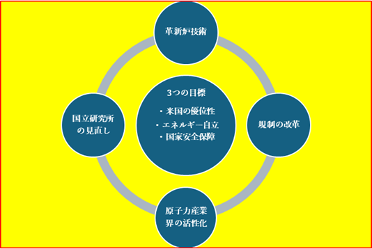 | 原子力規制の近代化 ・安全上の懸念と経済および国家安全保障における原子力エネルギーの利点とのバランスを確保 ・規制および指針文書を包括的に改正するための規則制定を18 ヶ月以内に完了 | ・ライセンスの有効期間を制限する規制を見直し、必要に応じてその有効期間を延長 ・マイクロリアクターおよびモジュール型リアクターの、ライセンスの大量の取得手続きを確立し、申請の標準化も認める ・国防総省またはエネルギー省によって安全に試験された原子炉設計の承認を迅速化する手続きを確立すること ・国家環境政策法(NEPA)への準拠に関する規制を改定 ・科学的根拠に基づく放射線限度を採用し、不適切な放射線被曝モデル(線形モデル)に依存しない ・ライセンスの承認のための固定期限を設定し、新規原子炉の建設・運転には18ヶ月、既存原子炉の継続運転には12ヶ月の期限を定める |